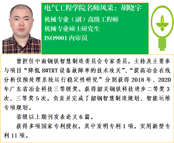 胡晓宇(副)高级工程师 发布日期:2023年04月24日 22:47 胡晓宇,机械专业(副)高级工程师,机械专业硕士研究生,ISO9001内审员。 曾担任中南钢铁智慧制造委员会专家委员,主持及主要参与项目“降低8#TRT设备故障率的技术攻关”、“提高冶金在线分析仪预处理系统运行稳定性研究”分别获得2018年、2020年广东省冶金科技三等级奖。获得韶关钢铁科技进步二等奖3次、三等奖5次。负责并完成了韶钢智慧制造规划、智能运维专项规划。省级以上期刊发表论文6篇。获得多项国家专利授权,其中发明专利1项,实用新型专利11项。 上一条:田亚娟副教授 下一条:冯伯翰高级实验师 【关闭】