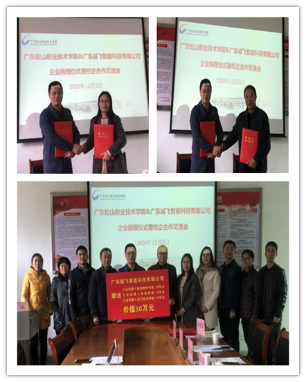 为促进电气工程学院和机械工程学院相关专业发展,助力机电一体化技术、工业机器人技术等专业建设,广东诚飞智能科技有限公司向电气工程学院和机械工程学院各捐赠了一批价值15万元的工业机器人基础教学系统、工业机器人拆装系统和工业机器人实习实训系统等3款教学仿真软件共计60个节点,总价值达30万元。